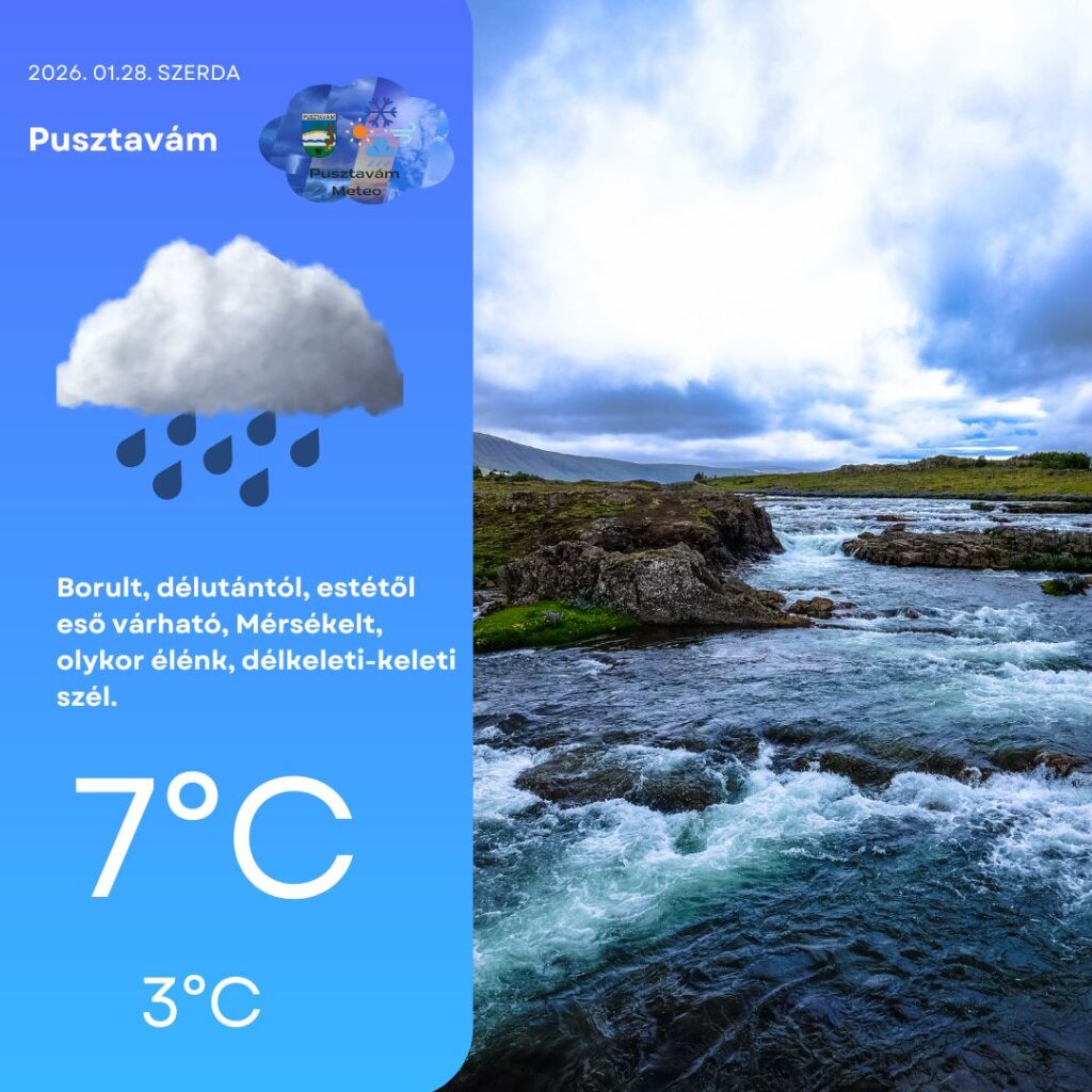 Csütörtökön napközben már a ciklon hidegfrontja lesz felettünk. További csapadék várható, főként a reggeli, délelőtti órákban, amely délutántól Pusztavám térségében fokozatosan megszűnni látszik. A felhőzet ekkor már szakadozhat, vékonyodhat, de teljes felszakadás nem biztos.