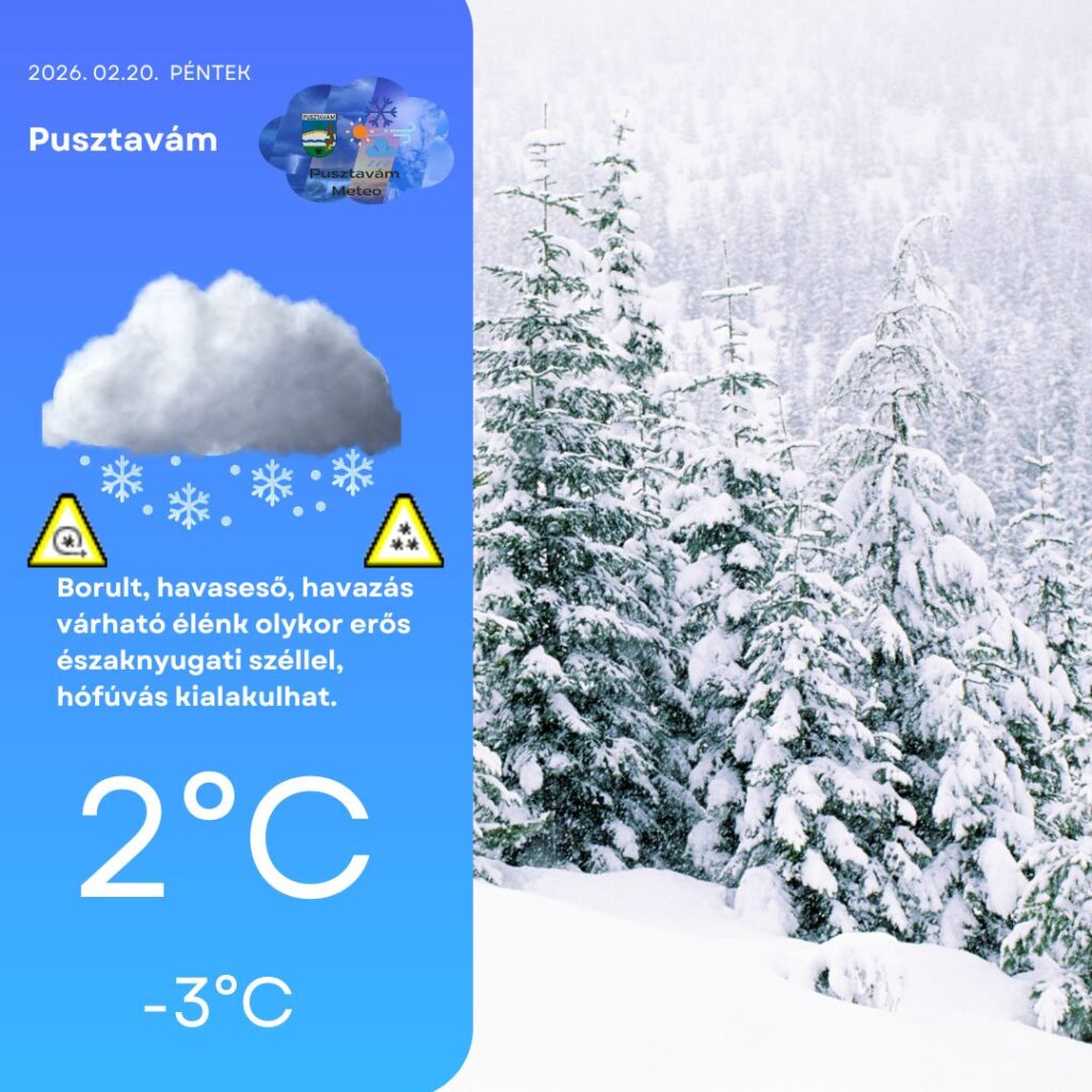 Napközben az északnyugati szél megélénkül, és a kitettebb területeken hófúvás, hóátfúvás is előfordulhat, ami ronthatja a látási viszonyokat és nehezítheti a közlekedést. Az esti órákban fokozatosan felszakadozik a felhőzet, a frissen lehullott hó pedig gyors lehűlést segít elő: estére már -3°C körüli hőmérséklet valószínű.