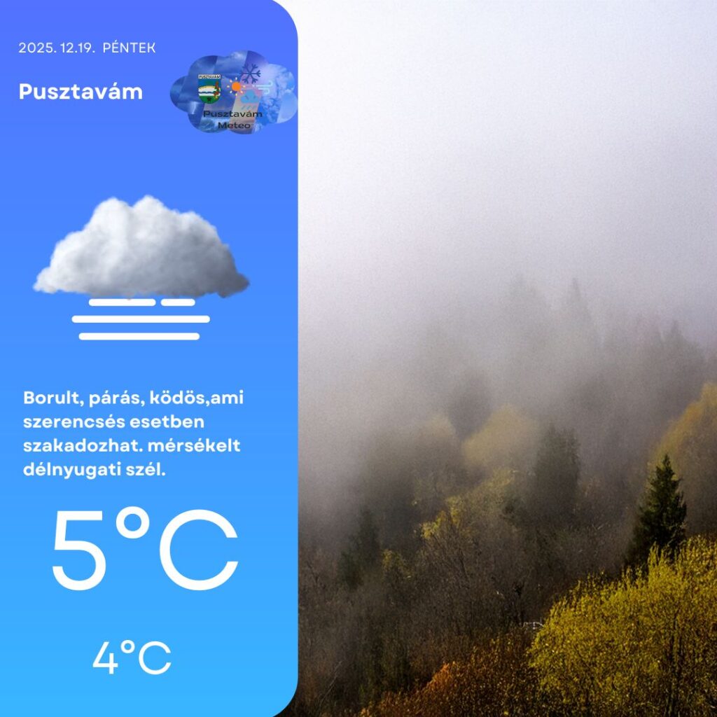 Pénteken tartósan megmarad a zárt ködfelhőzet, térségünkben kicsi az esély a ködpárna felszakadására, legfeljebb a délutáni órákban mutatkozhat átmeneti vékonyodás.