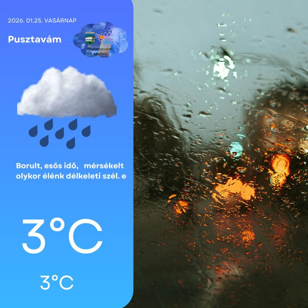🌧️ Vasárnap egy tőlünk délre örvénylő mediterrán ciklon csapadékrendszere ér el bennünket. Az előrejelzési térképek alapján Pusztavámon  esőre számíthatunk, míg a magasabban fekvő területeken havas eső, sőt helyenként kisebb havazás is előfordulhat.  A délkeleti szél mérsékelt marad, időnként élénk, akár erős lökések is kísérhetik 🌬️, ami tovább fokozza a kellemetlen hőérzetet. A hőmérséklet délután 3°C körül alakul, és az esti órákban sem várható nagy hőingás, vagyis gyakorlatilag „egyhelyben toporog” majd a hőmérséklet.