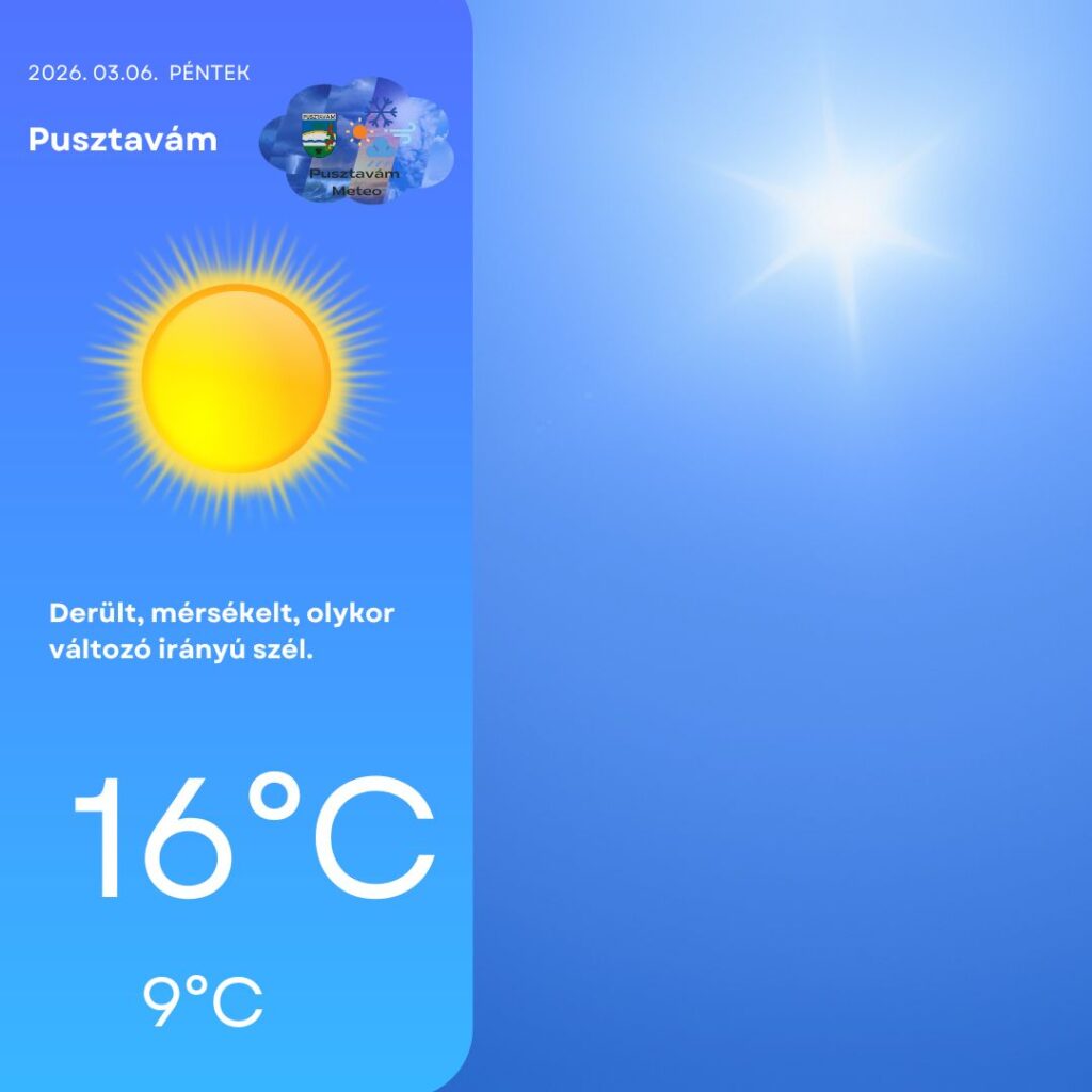 Pénteken sok napsütésben lesz részünk, legfeljebb néhány vékony fátyolfelhő jelenhet meg az égen, de ezek csak szűrni fogják a napsütést, érdemben nem zavarják a kellemes, tavaszias időt. A légmozgás továbbra is mérsékelt marad, többnyire északnyugati irányból fúj majd. A reggeli órákban még előfordulhat gyenge fagy, különösen a szélvédett, fagyzugos területeken, azonban a napsütés hatására gyorsan melegszik majd a levegő. Délutánra 16°C körüli csúcshőmérséklet várható, estére pedig 9°C köré hűl vissza a levegő. 🌤️