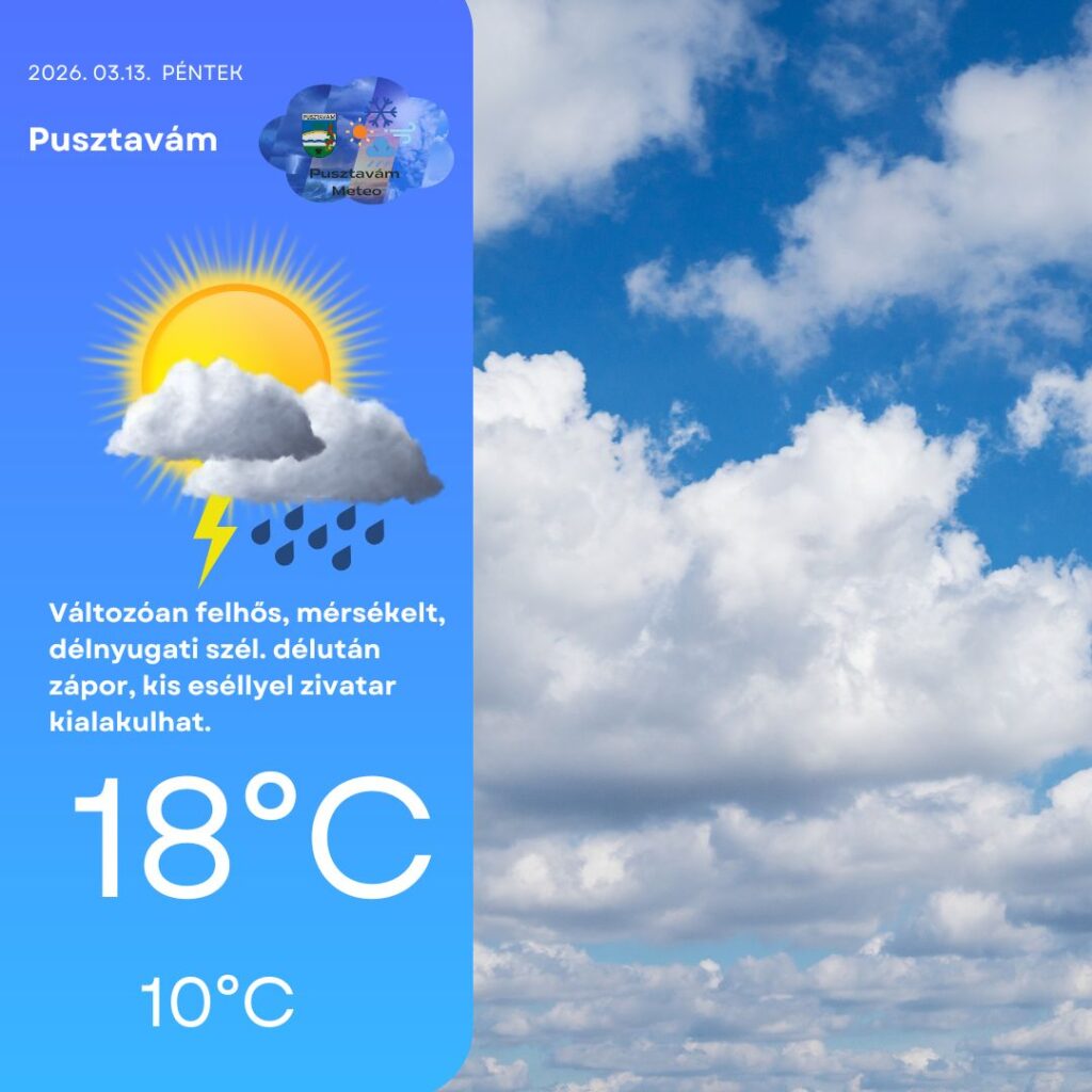 Pénteken változóan felhős égre tekinthetünk fel. A nap folyamán időnként kisüt a Nap, majd délutánra erősebben megnövekedhet a gomolyfelhőzet, és ezekből egy-egy futó zápor is kialakulhat, de tartós csapadék nem valószínű. A mérsékelt délkeleti szél továbbra sem lesz zavaró. A legmelegebb órákban 18°C körül alakul a hőmérséklet, estére pedig 10°C köré hűl vissza a levegő. 🌤️🌦️