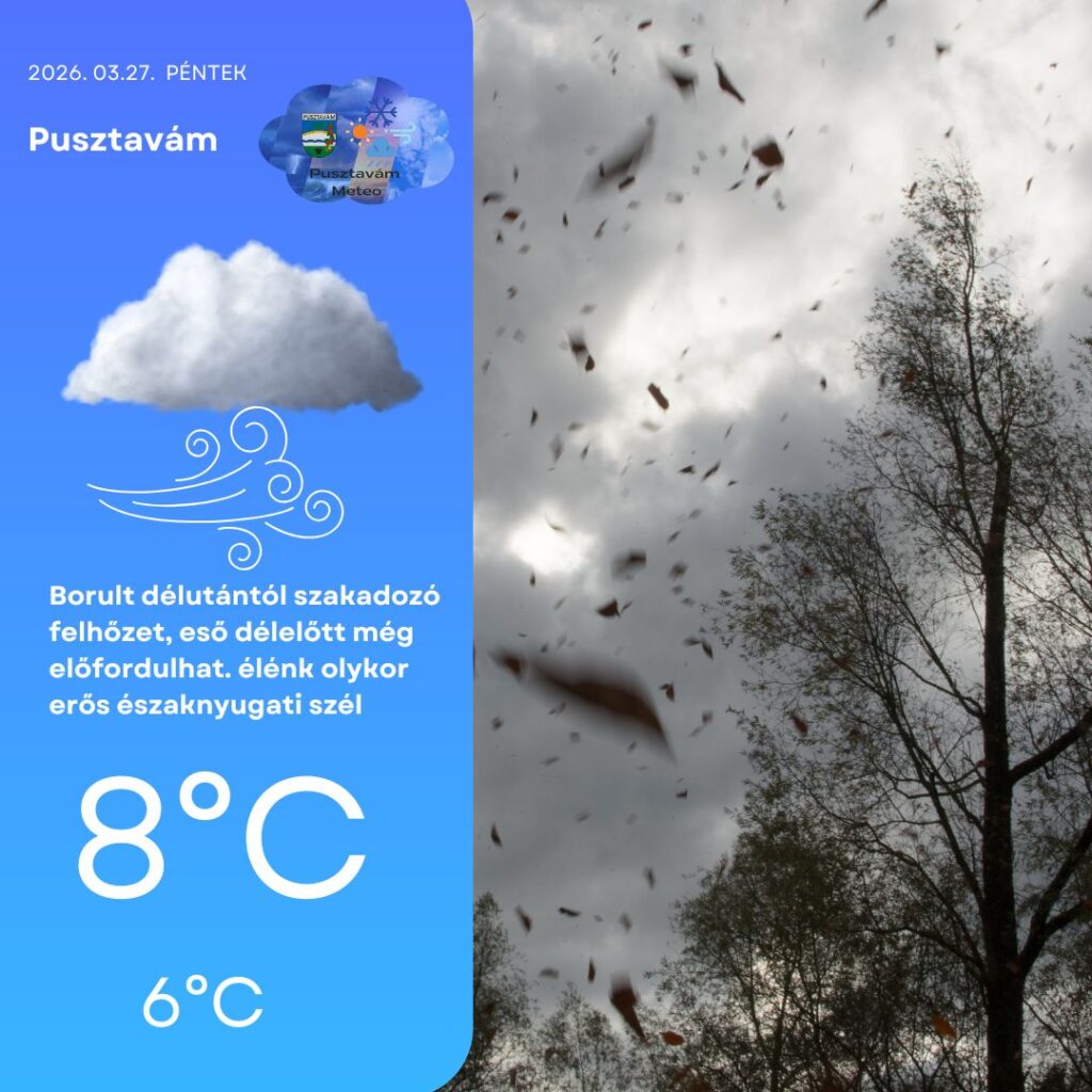 Pusztavámon a délelőtti órákban eláll az eső, de a szél kitart. A hőmérséklet a nap folyamán 4 és 8°C között alakul, így hűvös, szeles időre készülhetünk.