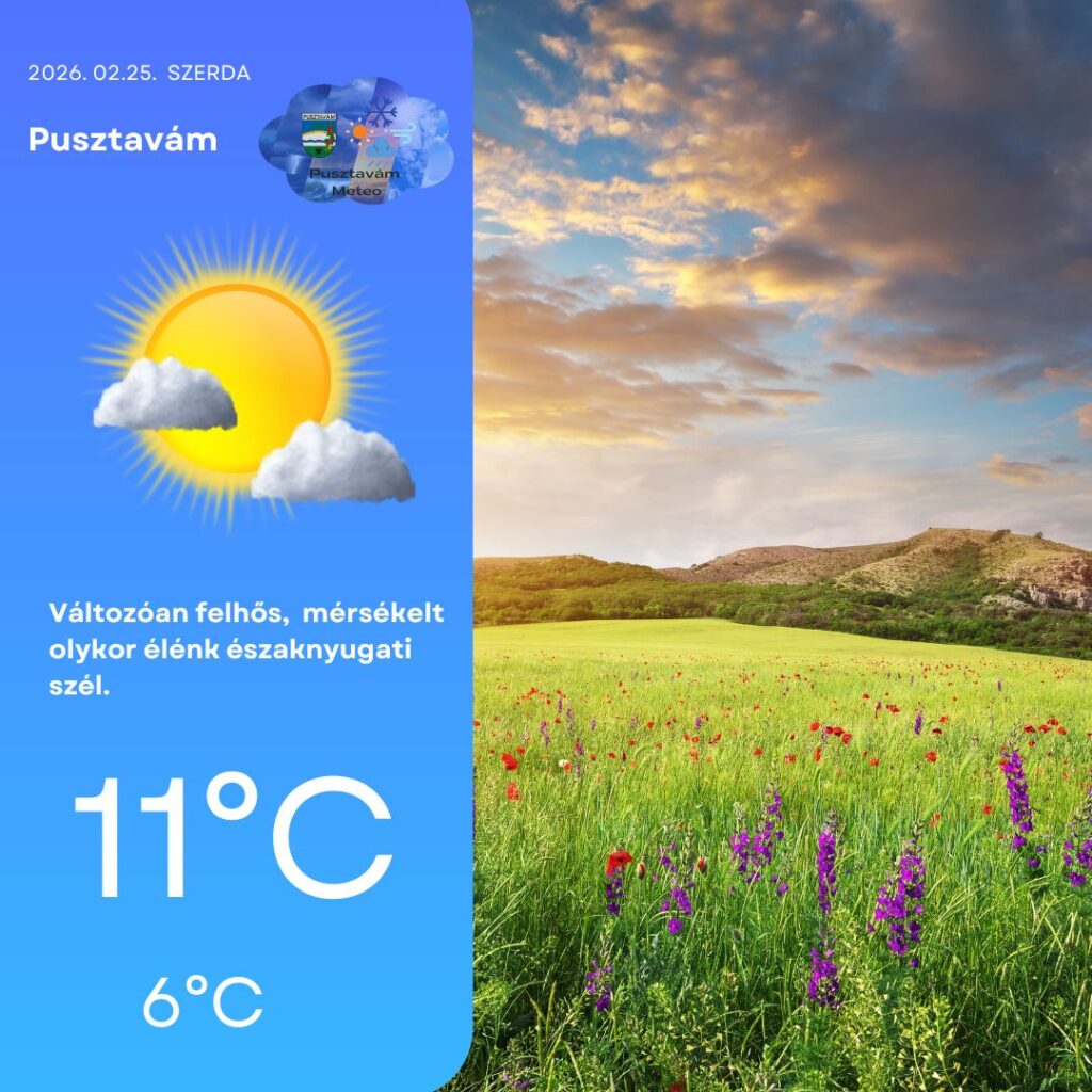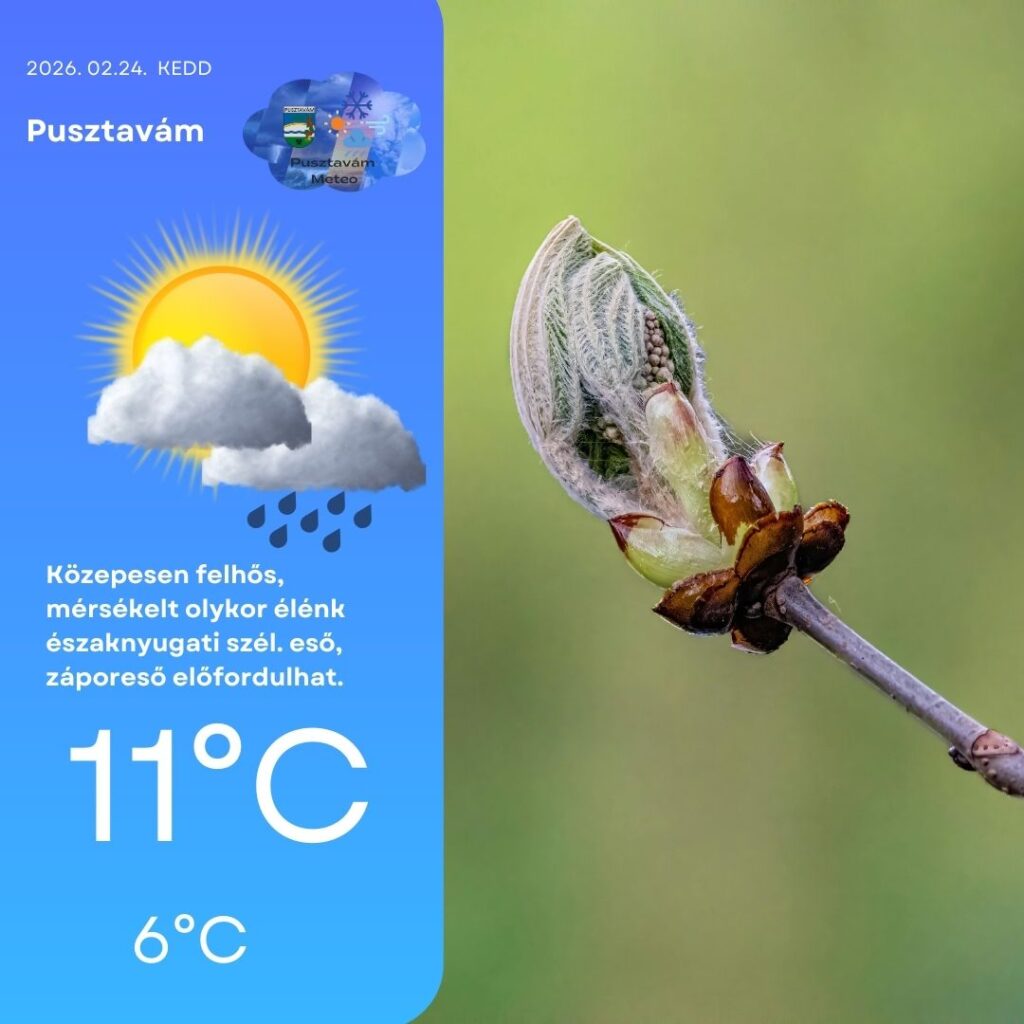 Szerdán már igazi kora tavaszi hangulat körvonalazódik. A kék égbolton gomolyfelhők úsznak majd, időnként árnyékot vetve a tájra, de ezek mellett több órás napsütésre is számíthatunk. Csapadék nem valószínű, az idő összességében száraz marad. A mérsékelt, olykor élénk északnyugati szél még emlékeztet a mögöttünk álló változékonyabb időszakra, de már nem lesz igazán zavaró. Reggel a hőmérséklet fagypont közelébe csökkent, délutánra azonban 11°C-ig melegszik, estére pedig 6°C köré hűl vissza a levegő.