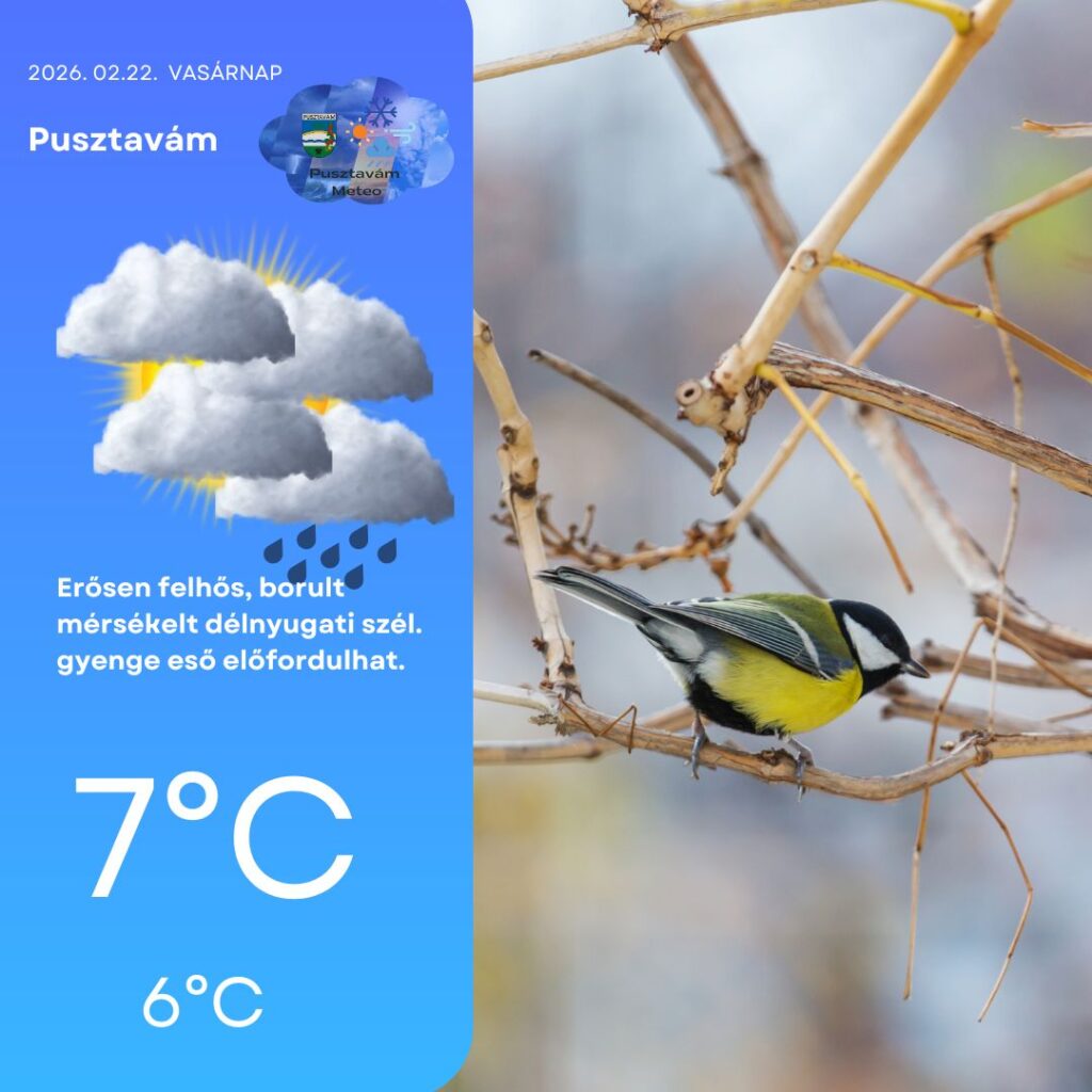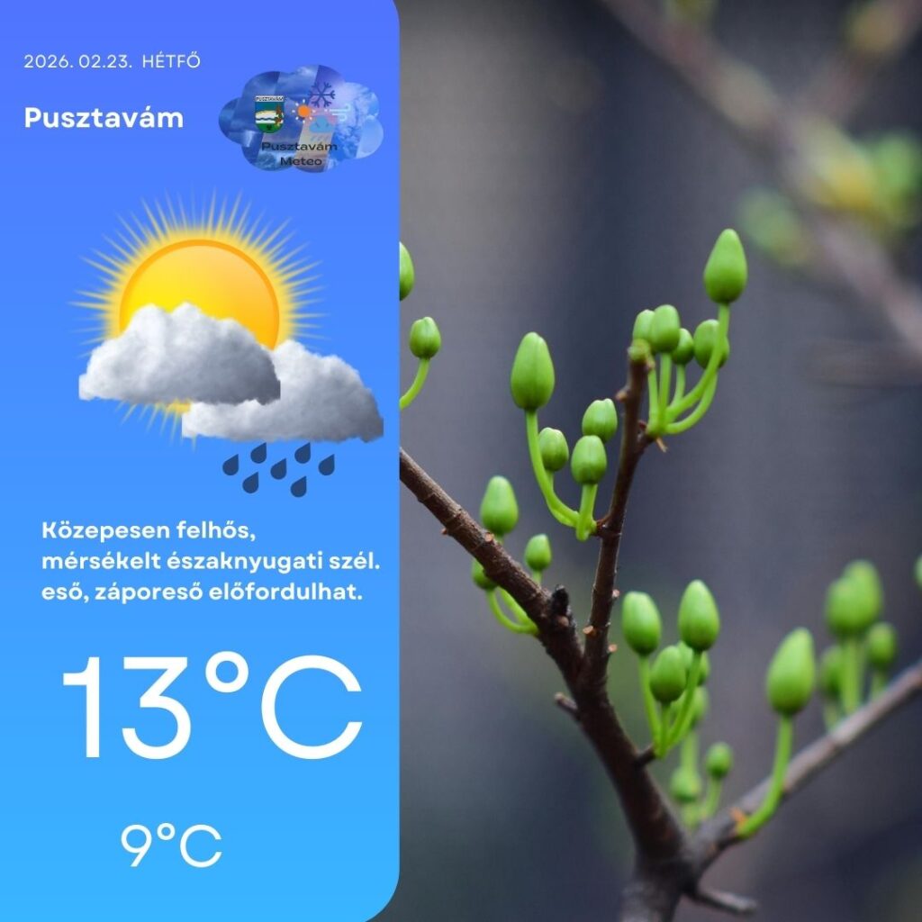 Hétfőn napközben többször is erősebben megnövekszik a felhőzet, és több hullámban érkezhet eső, zápor, sőt nem kizárt, hogy megdörren az ég, és megérkezik 2026 első zivatarja is térségünkbe. A légkör labilisabbá válik, így egy-egy intenzívebb zápor sem lenne meglepetés. A mérsékelt északnyugati szelet időnként élénk széllökések kísérhetik. A délutáni órákban már kifejezetten enyhe idő várható, 13°C körüli maximum, estére pedig 9°C-ig hűl vissza a levegő.