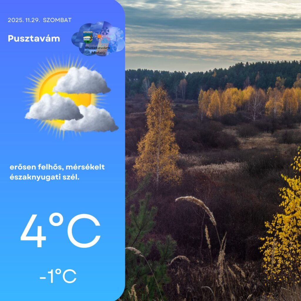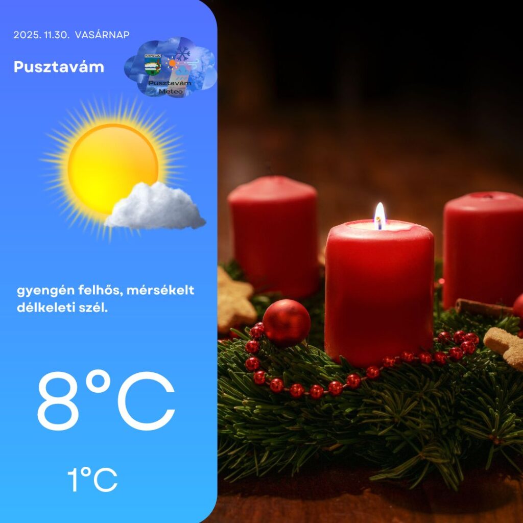 🌤️ Vasárnap távolodik a ciklon, vele együtt a felhőzete is. Gyengén felhős, délutánra inkább napos idő valószínű. A délnyugati–nyugati szél gyenge, mérsékelt marad. A gyengén párás reggelt követően a levegő 8°C környékére melegszik, este ismét fagypont közelébe hűl.