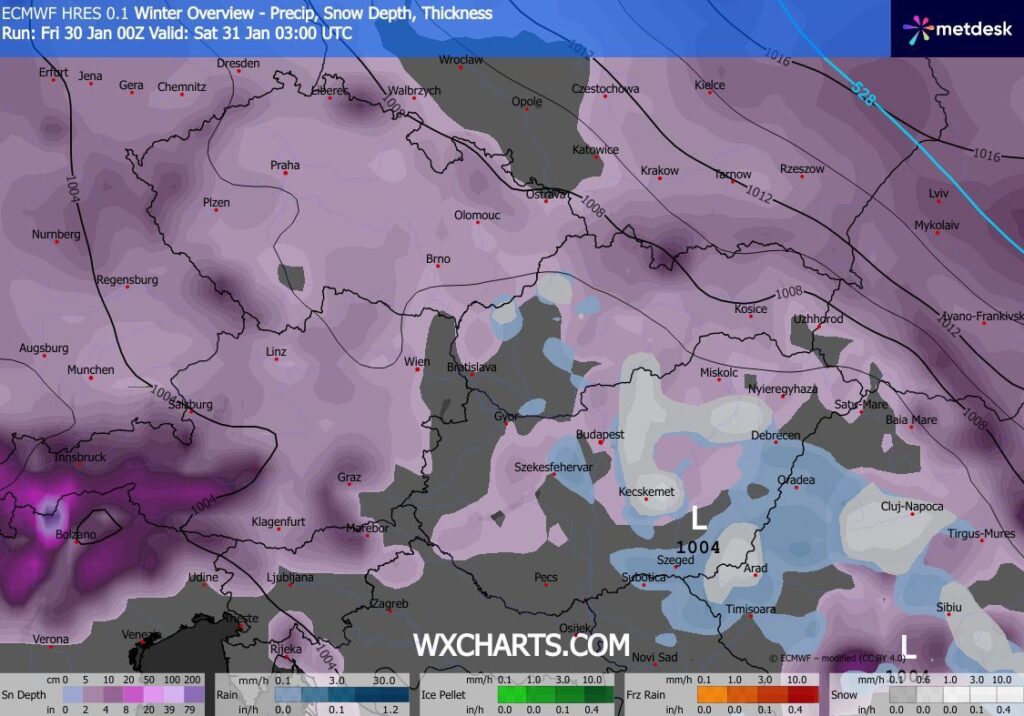Kezdetben még nedves légtömeg határozza meg az időjárást, ezért csapadékra is számítani kell. Pénteken estig elsősorban eső formájában hullhat a csapadék, majd szombatra virradóan, a beáramló hidegebb levegő hatására már havas eső, helyenként gyenge havazás is előfordulhat. Számottevő havazás azonban nem valószínű, mivel a hideg levegő magja nem érkezik meg fölénk, és a csapadékhajlam is fokozatosan csökkenni fog.