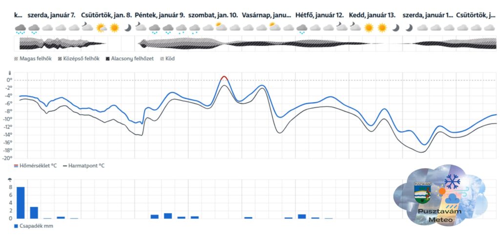 Pusztavám térségében nem kizárt a –10 °C alatti hajnali minimum, és péntek virradóra is –10 °C körüli értékek körvonalazódnak.