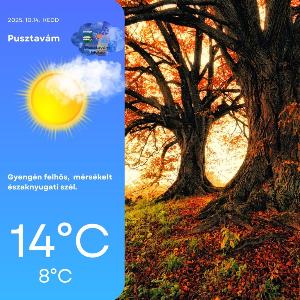 A kedd reggel már érezhetően hűvösebben indult, a hajnalban többfelé 2 °C alá csökkent a hőmérséklet. A nap folyamán túlnyomóan napos, száraz időre számíthatunk, bár a délutáni óráktól nyugat felől kevés fátyol-, illetve gomolyfelhő jelenhet meg az égen. Csapadék kialakulásának esélye elhanyagolható. A gyenge, időnként mérsékelt északias szél a nap folyamán hűvösebb, szárazabb levegőt szállít térségünkbe. Délutánra 14 °C körül alakul a csúcshőmérséklet, estére pedig gyorsan visszahűl a levegő, 8 °C körüli értékekkel.