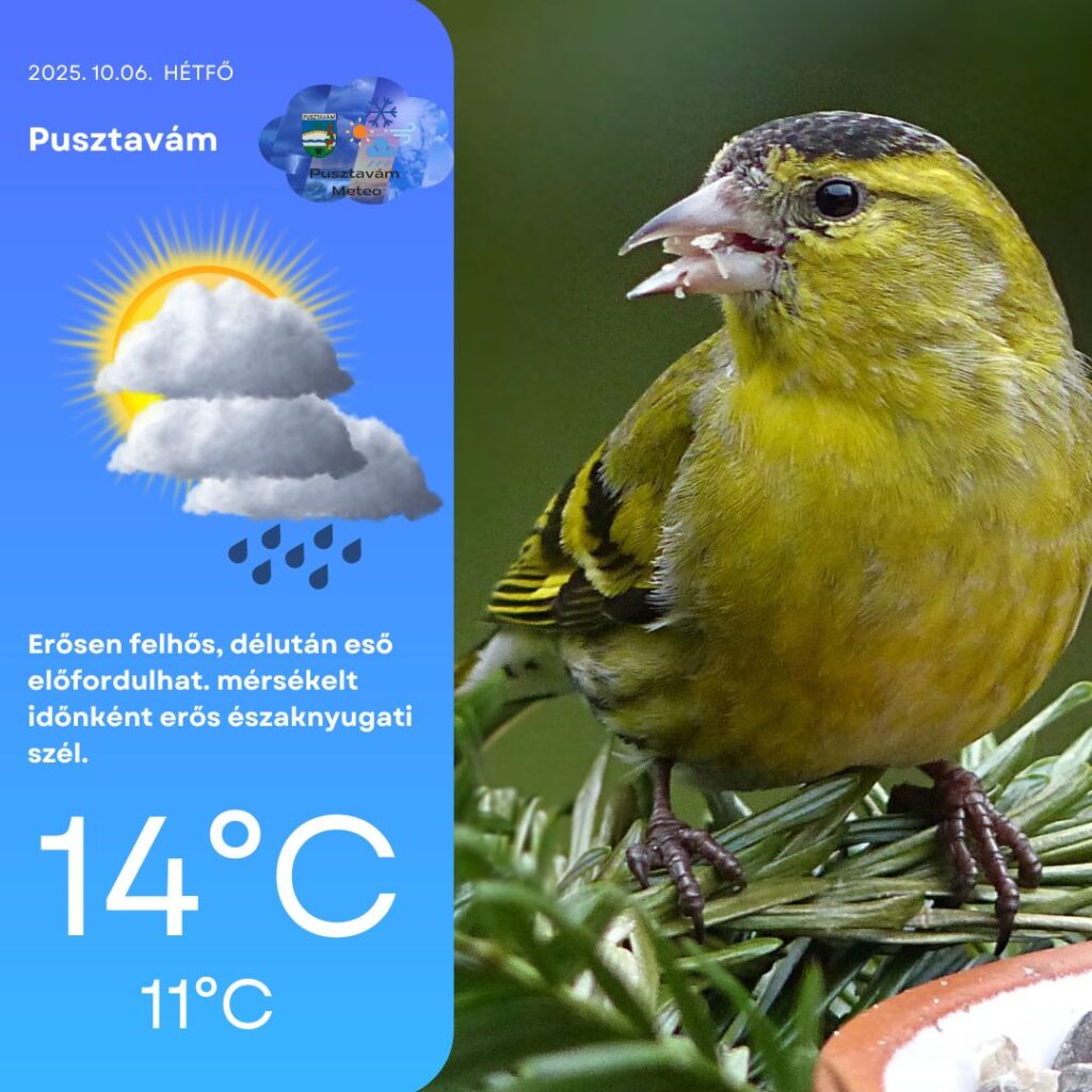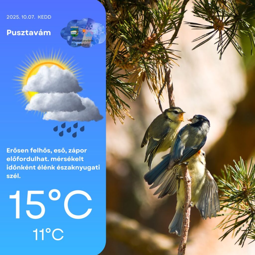 Továbbra is élénk marad az északnyugati szél, amely időnként erős lökésekkel is kísért lehet. A változó felhőzetből futó záporok napközben több helyen előfordulhatnak, ám tartós, csapadékos időre nem kell készülni. A hőmérséklet délután 15°C, este 11°C körül alakul.
